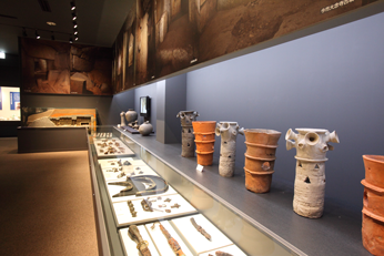博物館収蔵庫の一部を解放した展示スペースです。出土品が収蔵されている状態を間近で見学することができます。また、大型の出土品が展示してあり、見ごたえがあります。