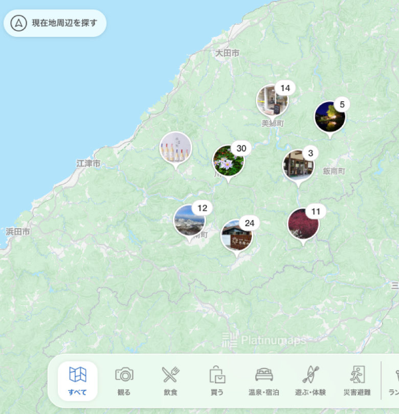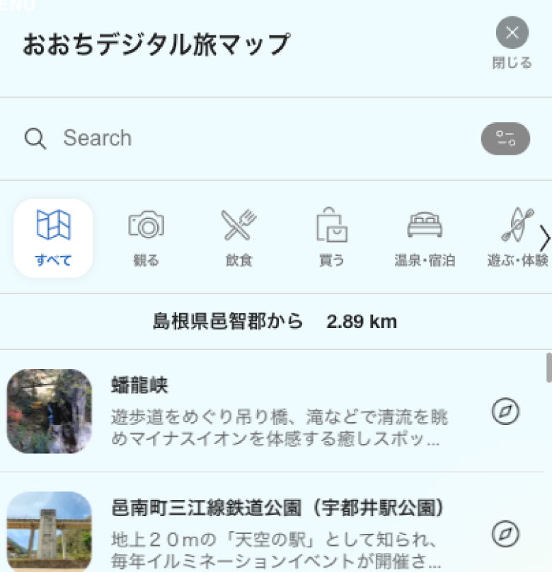 おおちデジタル旅マップは、スマートフォンの位置情報をONにするだけで、現在地周辺の観光スポットの見どころや飲食店等の情報が確認できるほか、災害時の避難場所情報などが検索可能です。